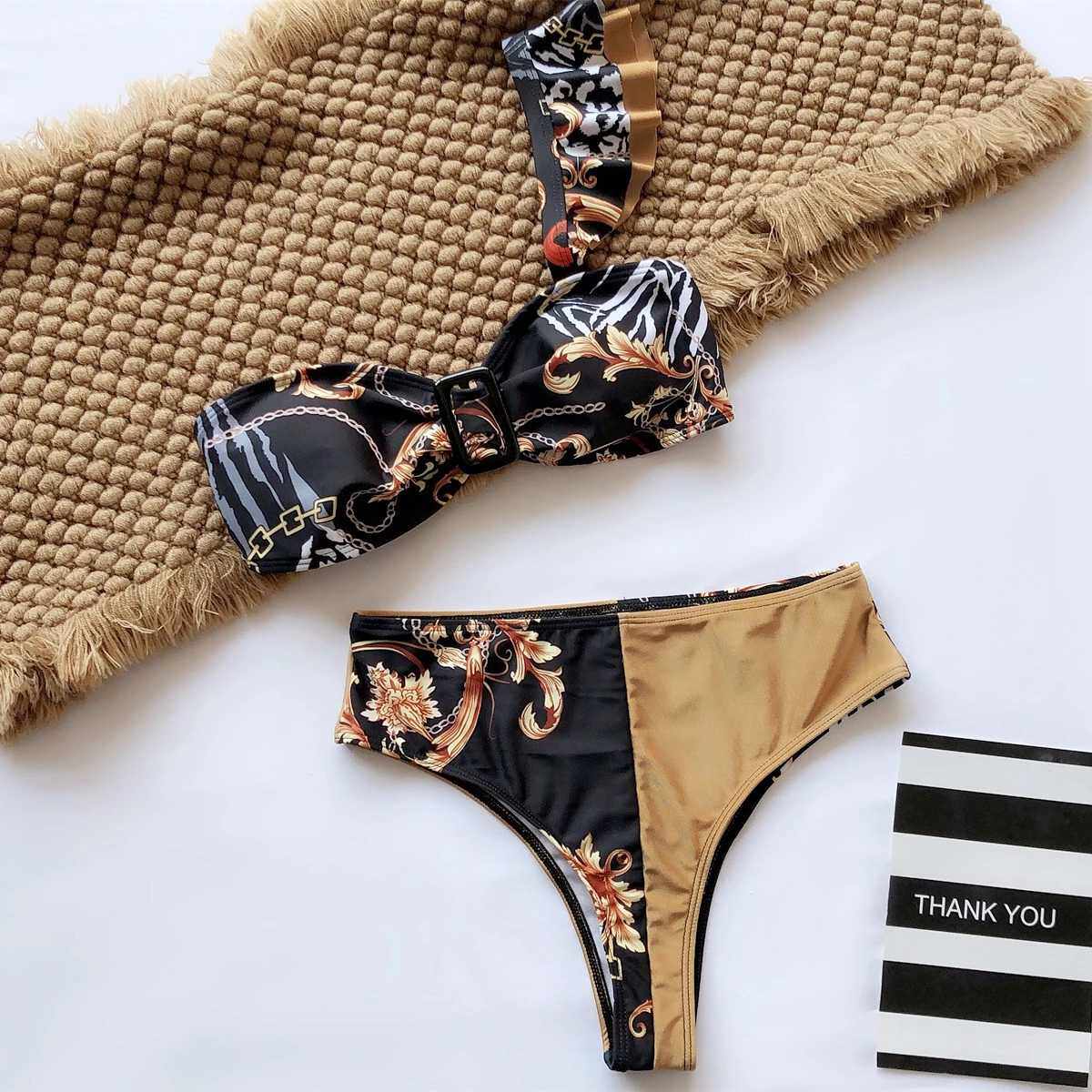 2020 New Bikini Swimsuit Ruffle One Shoulder Sexy Print Breast Wrap Bikini Two Piece Swimsuit Bikini