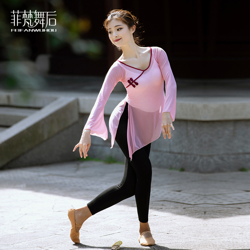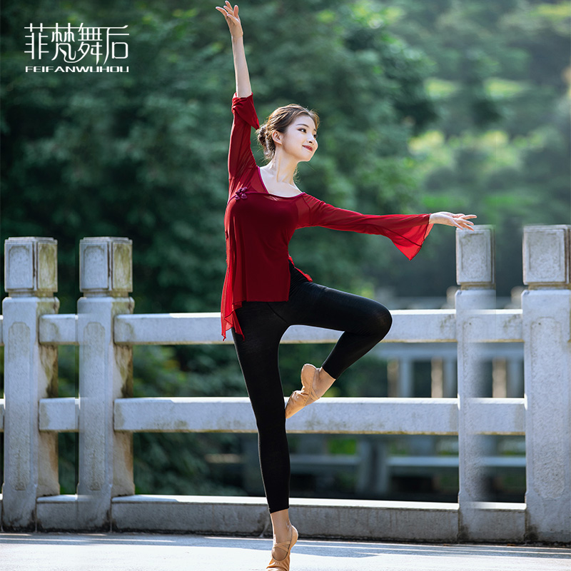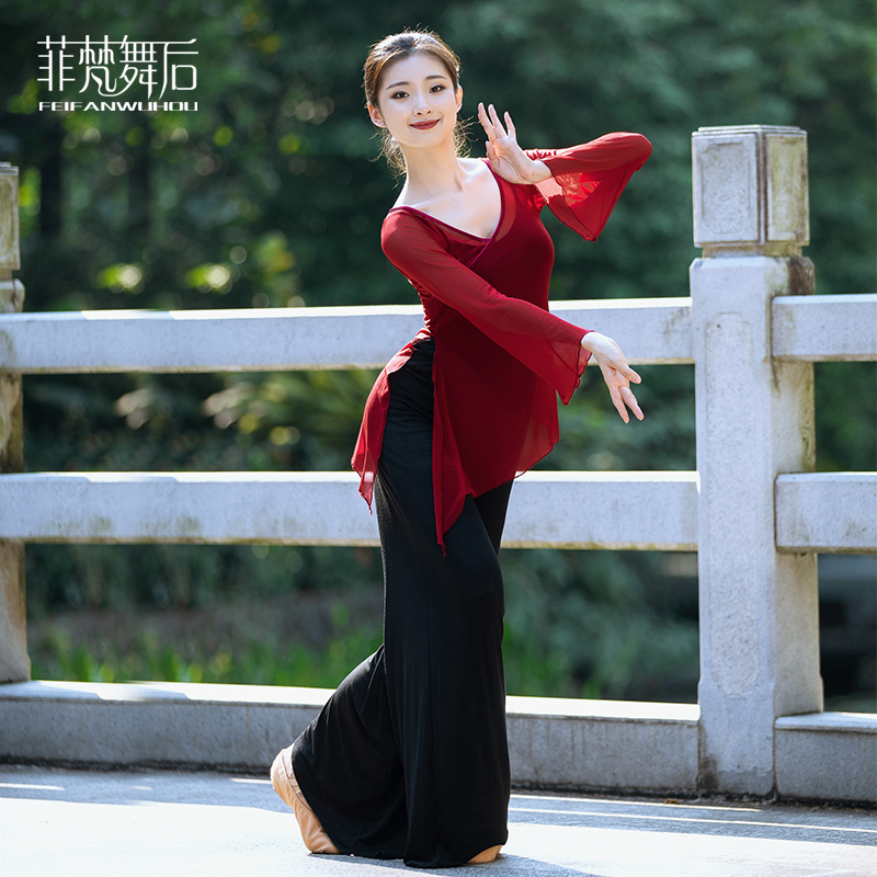 Chinese dance National classical dance practice suit Female adult body rhyme yarn clothing Mesh elegant top wide leg pants suit