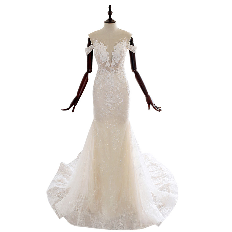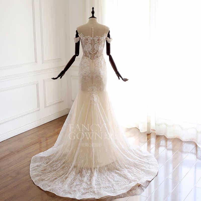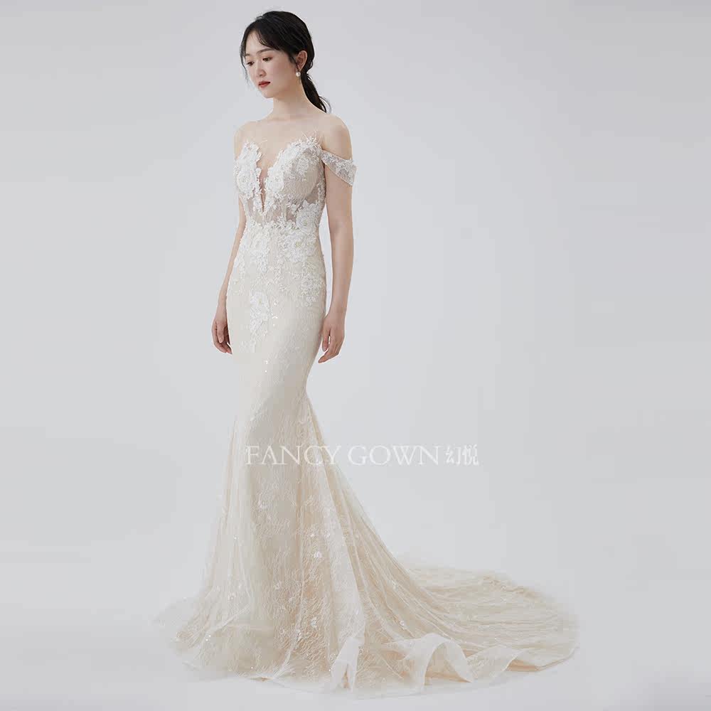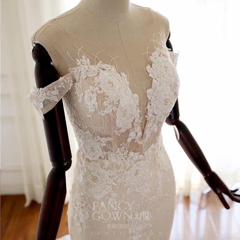 Phantom Yue - flower light three sheer invisible mesh vest word shoulder lace fishtail show thin slim slim beauty back light wedding dress