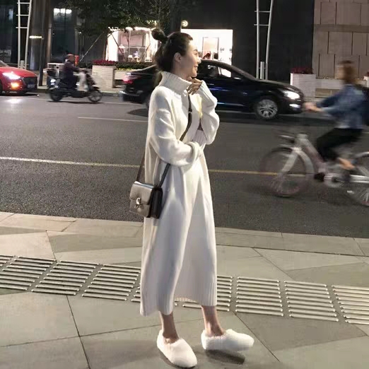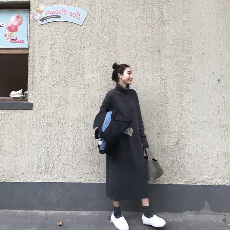 Net red turtleneck sweater skirt women's 2022 new mid-length version of the lazy style loose bottom knee knitted dress