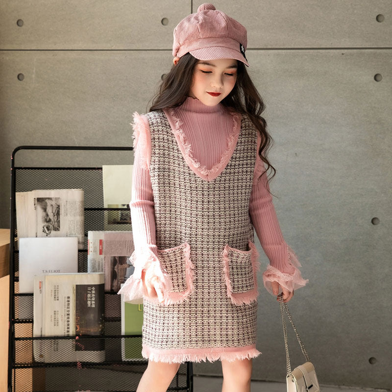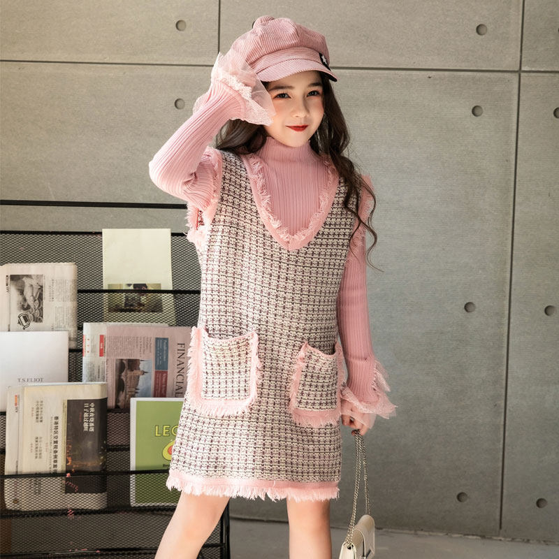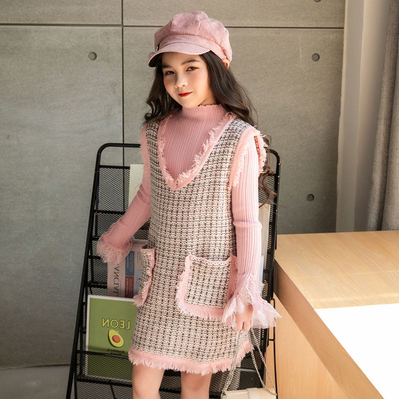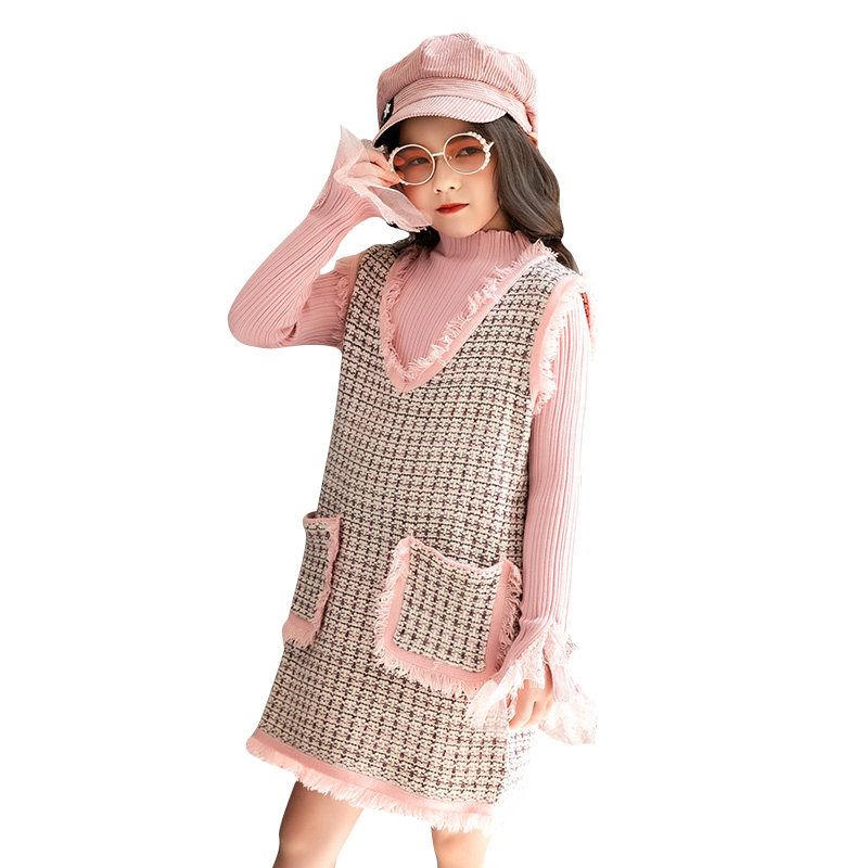 Two-piece Han-style pink dress Ocean Lotus Leaf Knitted High-collar Sweater Set