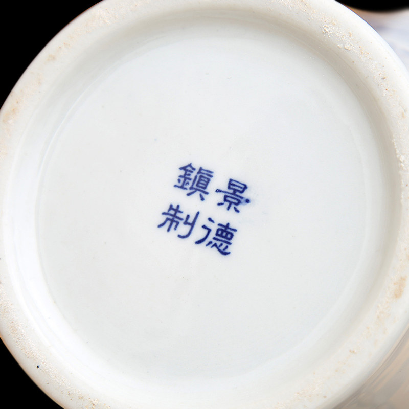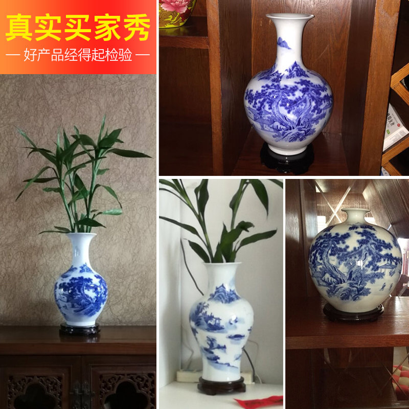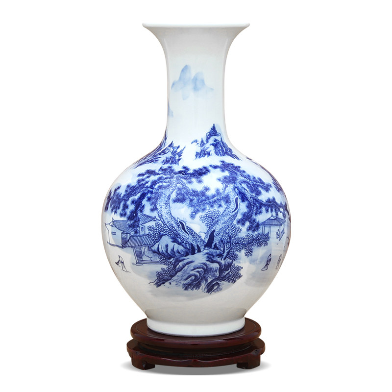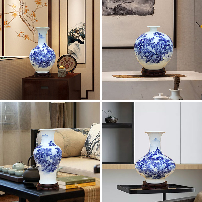 Blue and white landscape appreciation bottle (with wooden rotating base) Blue and white landscape fishtail bottle(with wooden rotating base) Blue and white landscape jade pot spring (with wooden rotating base) Blue and white landscape pomegranate bottle(with wooden rotating base