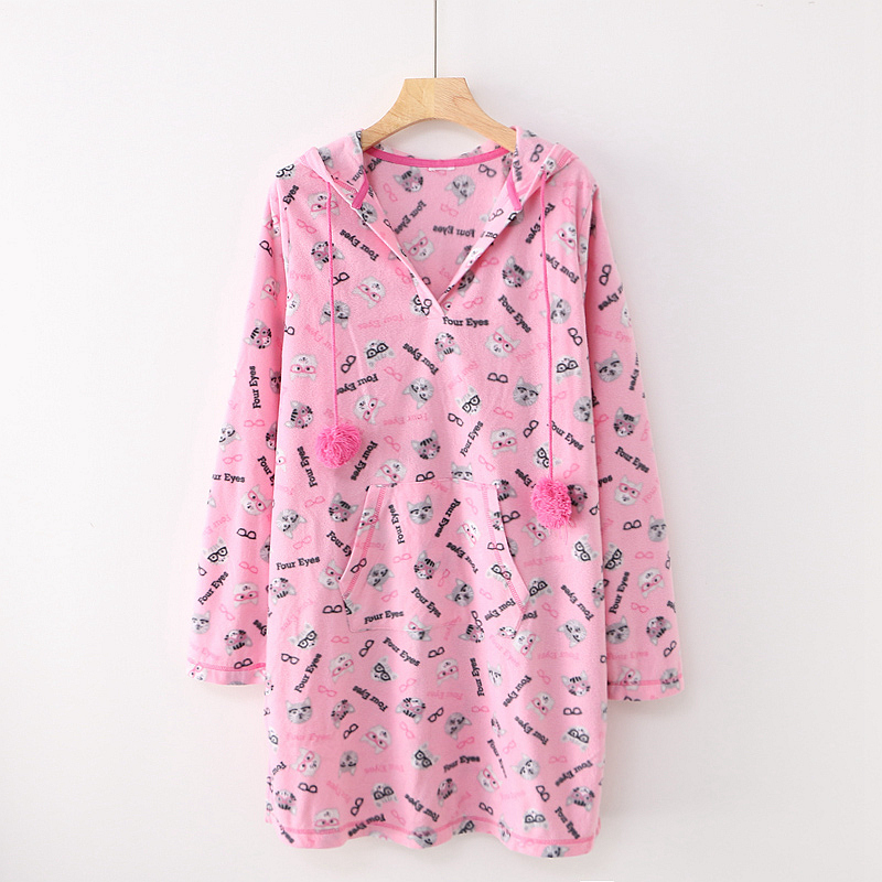 Printed home skirt autumn and winter new foreign trade women's wear age-reducing hooded kangaroo pocket long-sleeved polar fleece nightdress 7587