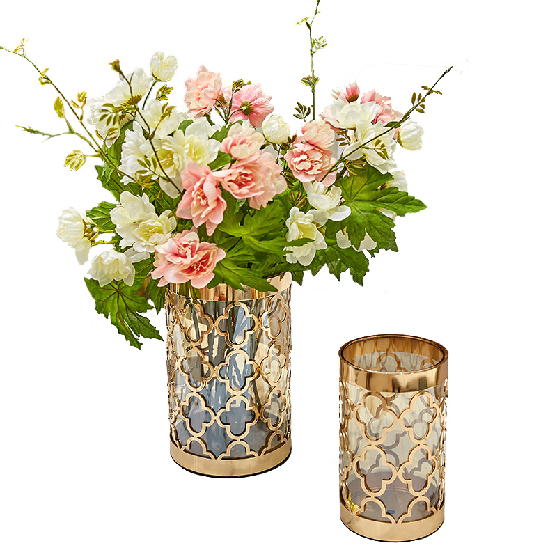 Light luxury gold stainless steel hollow geometric glass vase model room home living room dining table TV cabinet floral art