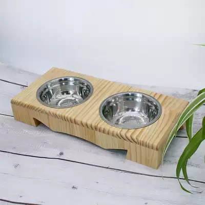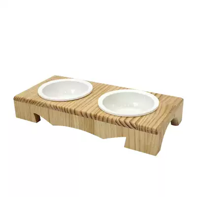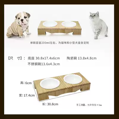 Solid wood frame oblique mouth double bowl cat bowl ceramic protection cervical spine 15 degree tilt ceramic stainless steel pet cat and dog rice bowl