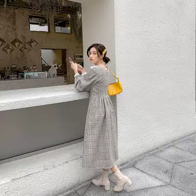 2021 Spring New Female French Palace V-Collar Waist Long Edition Temperament Splice Vintage Plaid Dress