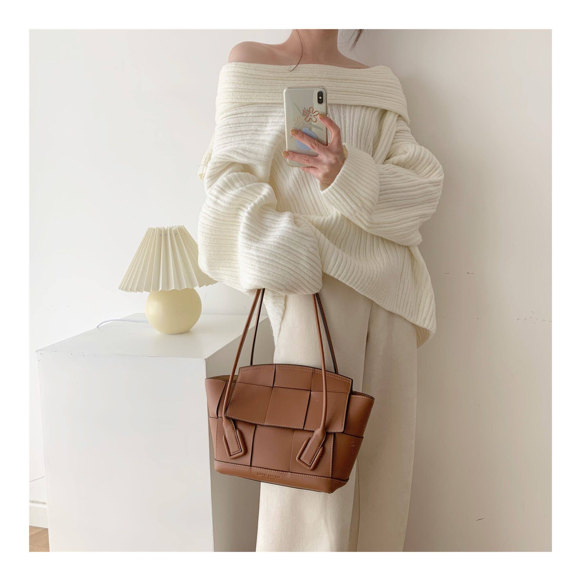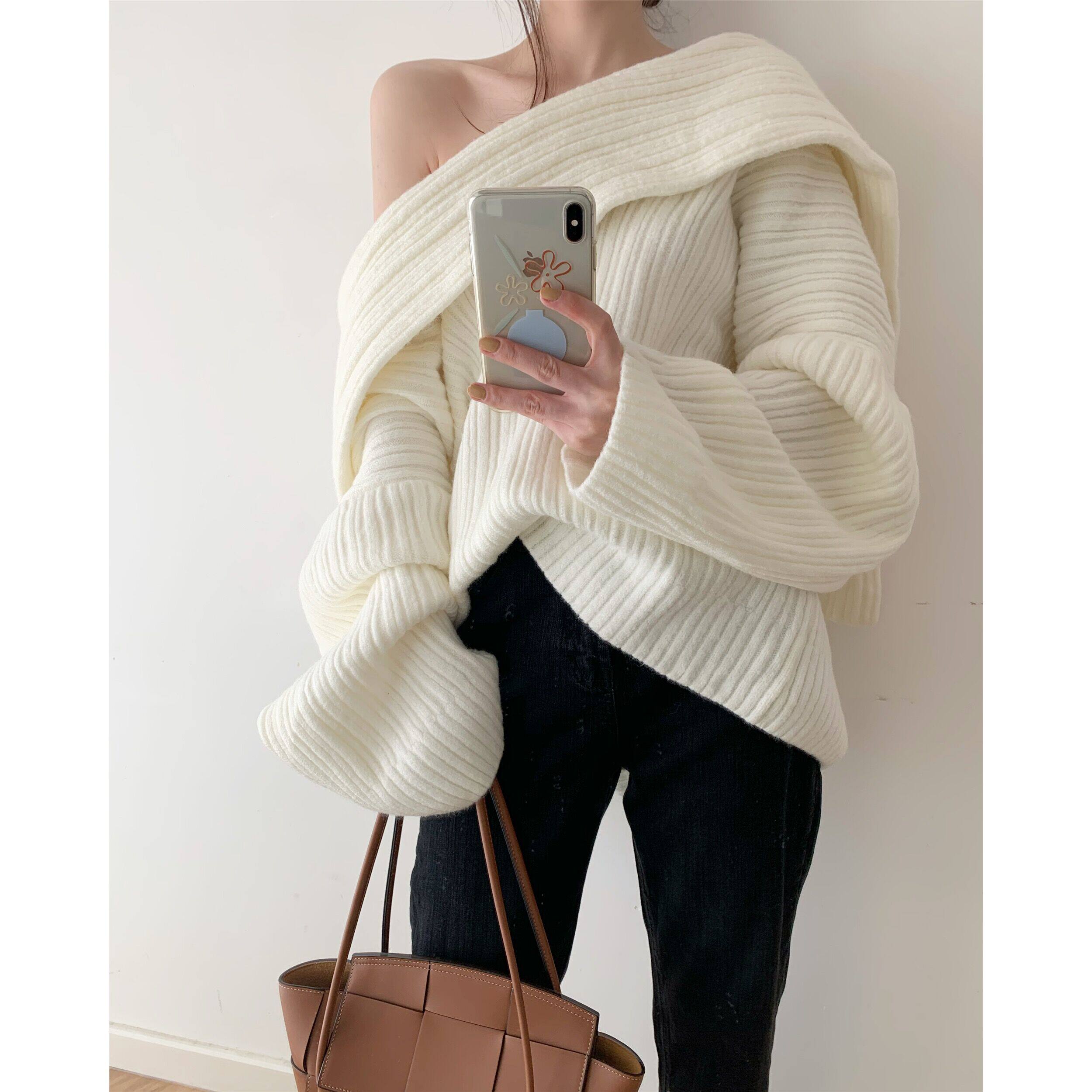 The White Moonlight in the Heart of ICTS Small crowd style design with irregular texture and silhouette white off-the-shoulder sweater