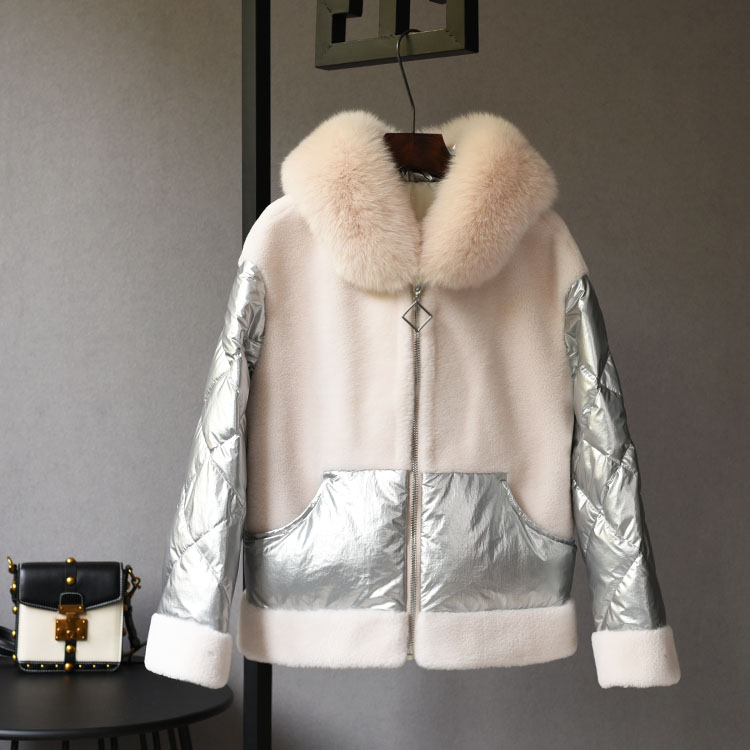 Fox fur collar even cap splicing down clothing leather grass big coat sheep cut suede granular sheep plush fur integrated jacket woman