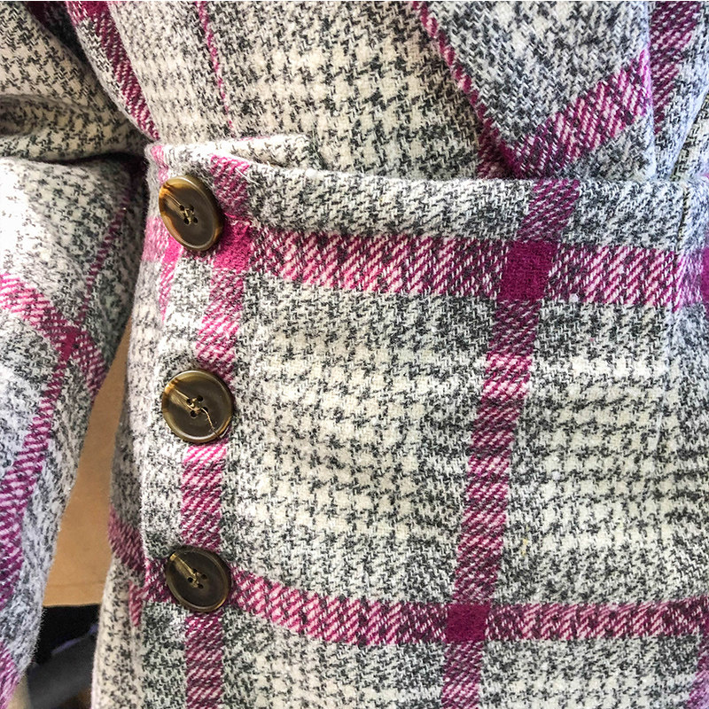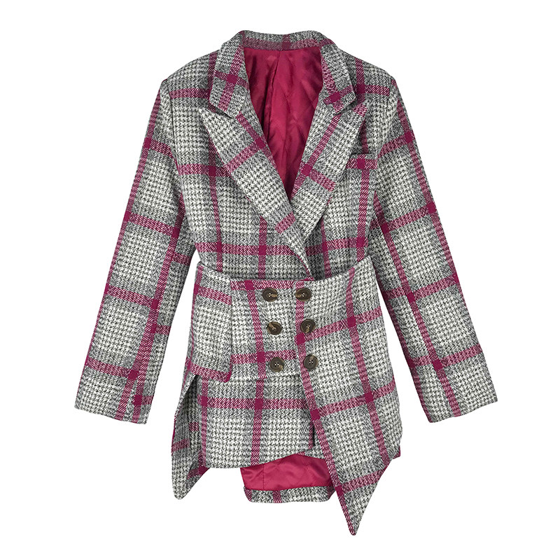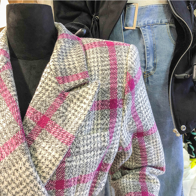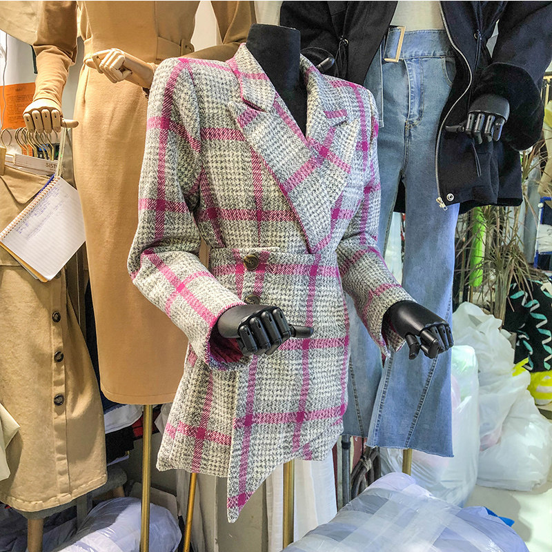2020 autumn and winter splicing fake two tweed medium and long pink plaid temperament waist suit collar dress