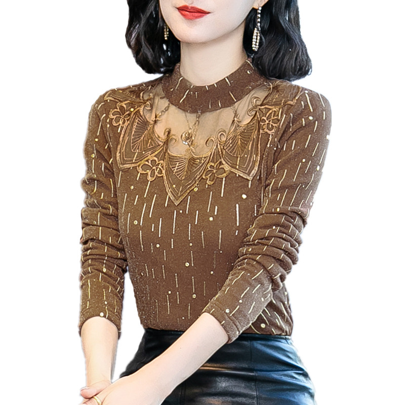 2022 autumn and winter new half-height necklace with velvety lace undershirt female long sleeve temperament covered belly mesh yarn blouse
