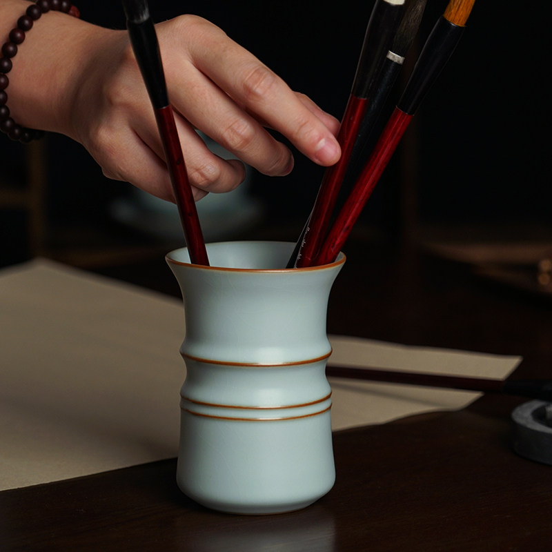 Ru kilo pen holder ceramic handmade retro book house porcelain Jingdezhen Ru porcelain ice cracked glaze gift box with cicadas winged blue porcelain