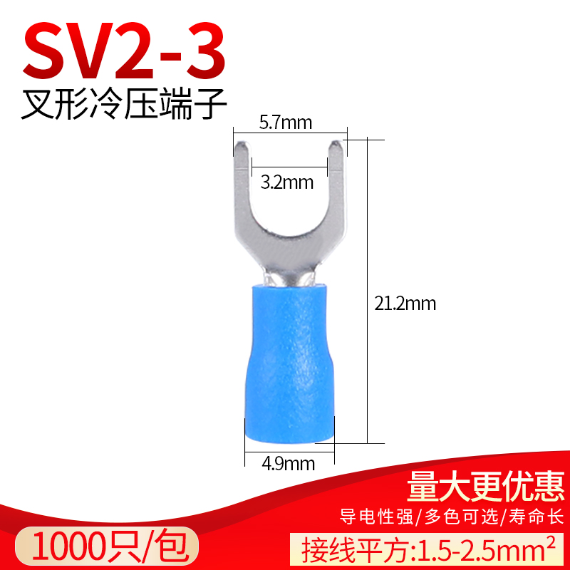 SV2-3 cold pressed wiring terminal fork-shaped pre-insulated terminal U-shaped end-head copper wiring terminal wiring ear 1000 only