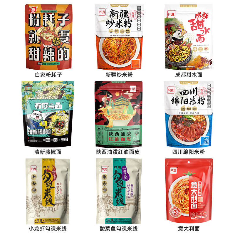 9 bags of 9 flavors(Combination 1) 6 bags of 6 flavors(Combination 2) 9 bags of 9 flavors (Combination 3) 6 bags of 6 flavors(Combination 4) (2 bags)Sweet water noodles Mianyang Rice Noodles (3 bags)