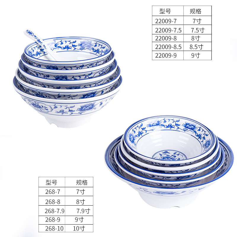 Melamine imitation porcelain blue and white porcelain small bowl soup bowl ramen beef noodle bowl hotel dining room commercial creative spicy hot tableware