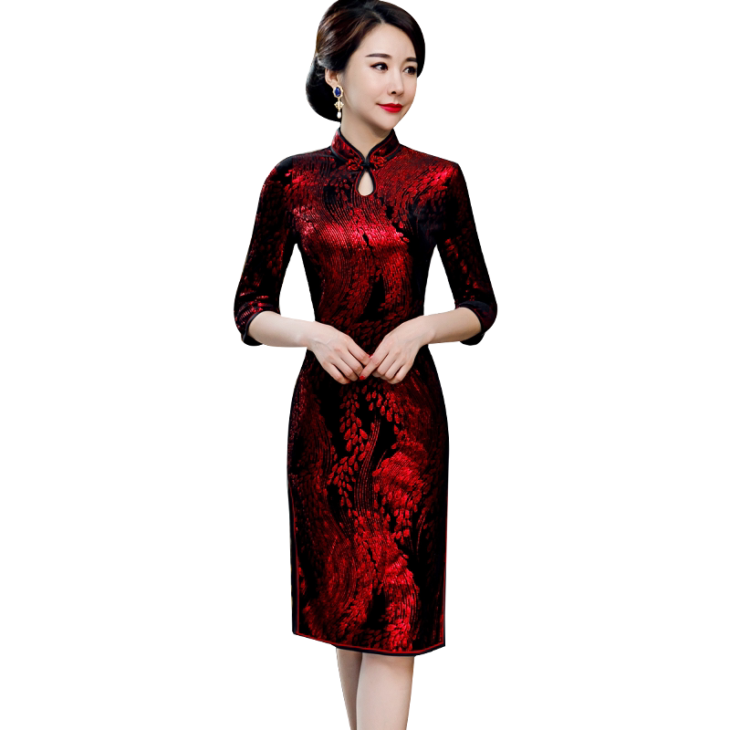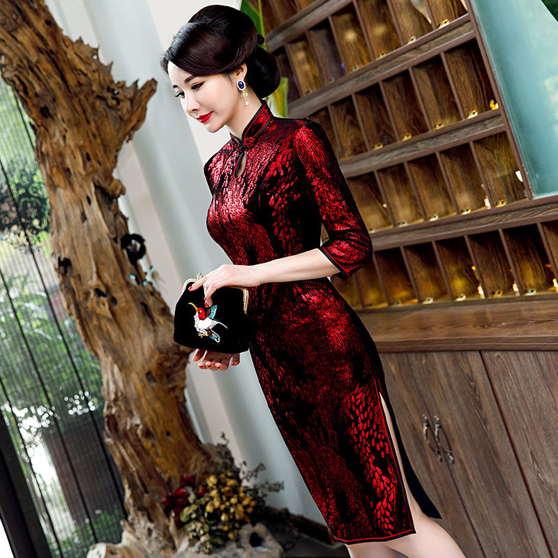 Gold velvet cheongsam autumn 2020 new female retro long-sleeved improved mother dress in the long version of temperament