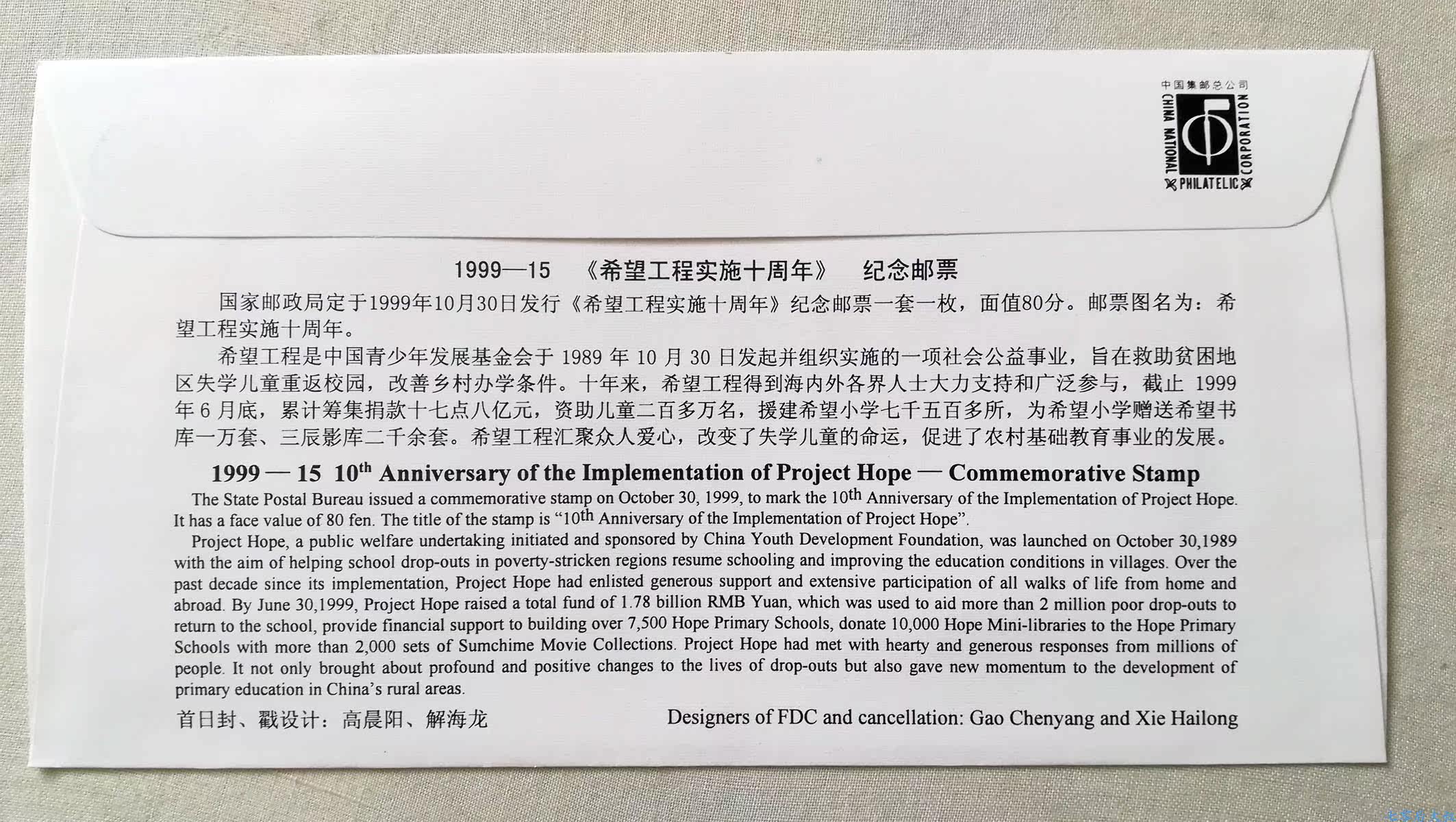 1999-15FIRST Day Cover of Head Office for the 10th Anniversary of Project Hope