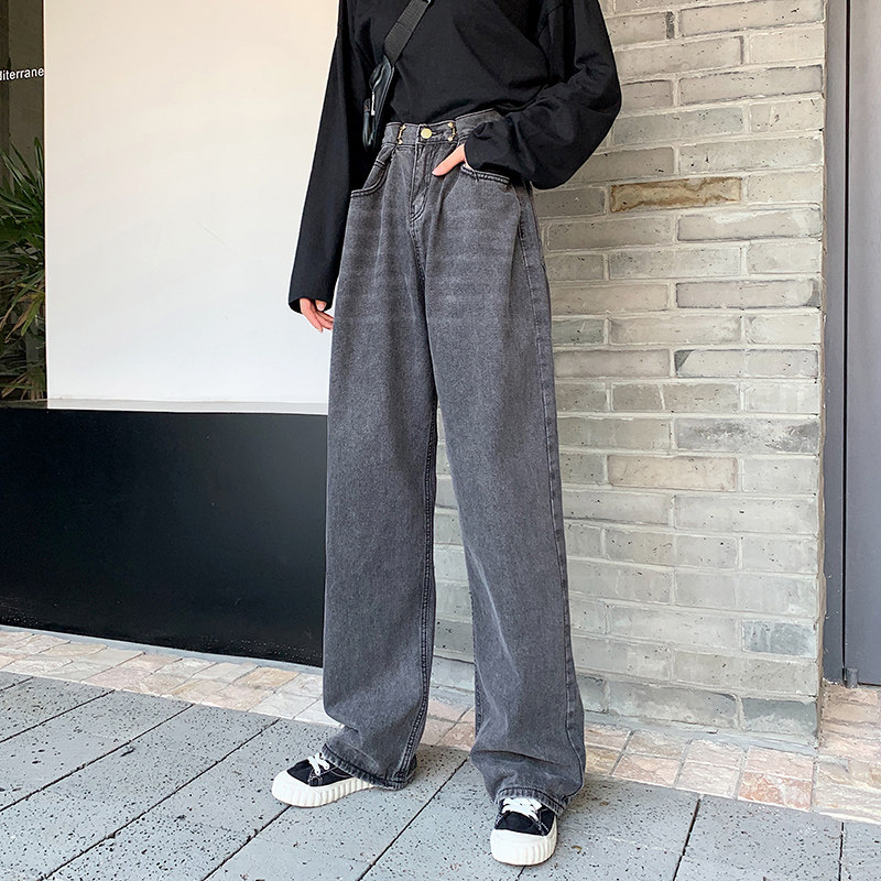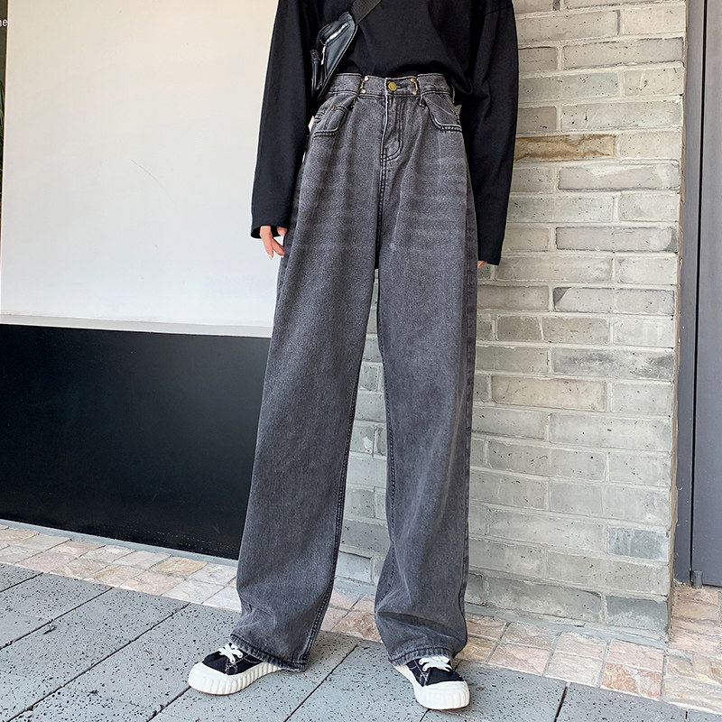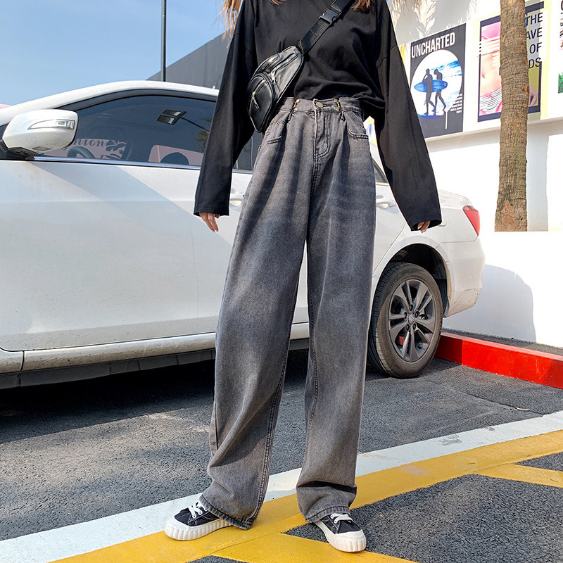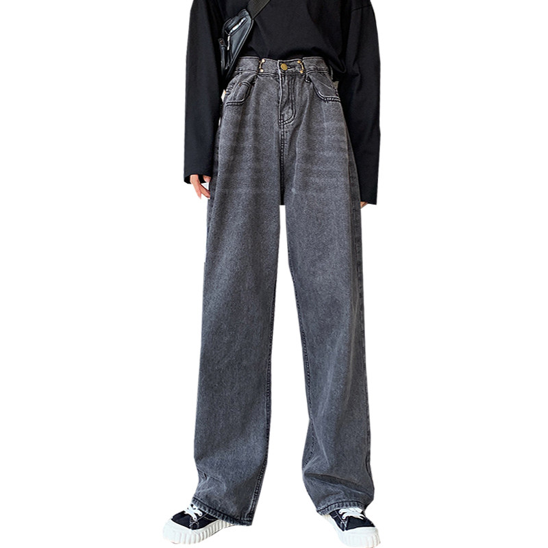 Black gray high waist extended denim wide leg pants women loose straight large size was thin autumn dad pants tall mopping pants