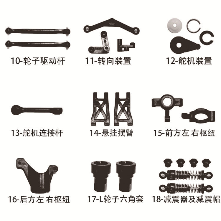 18301 Front and rear armor 18301 Front and rear shock support 18301 Left and right steering connecting rod 18301 Front and rear upper connecting rod 18301 Wheel drive rod 183