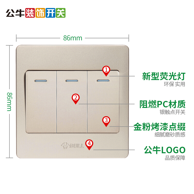 Bull Switch Home Socket Triple Open Three Single Control Power Wall Lamp 3 Open Wall Lamp Control Golden Panel