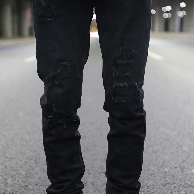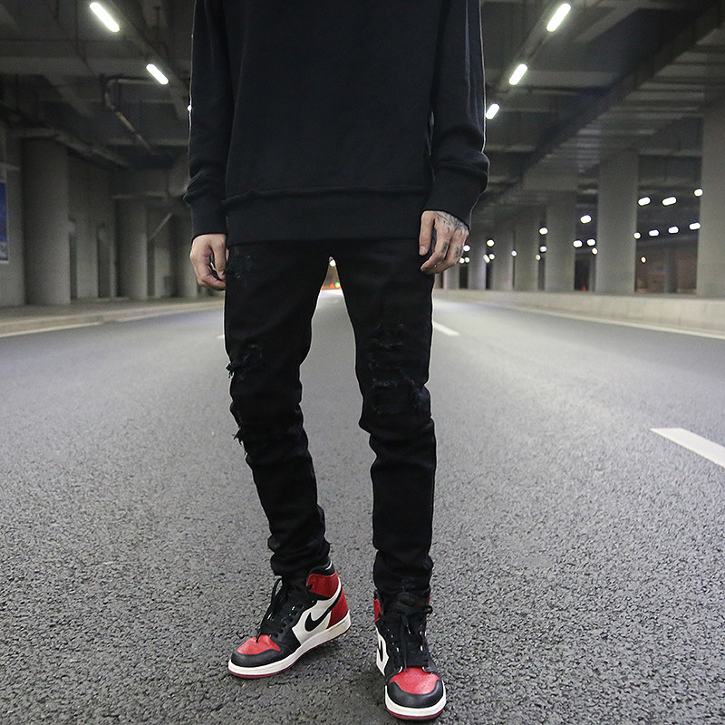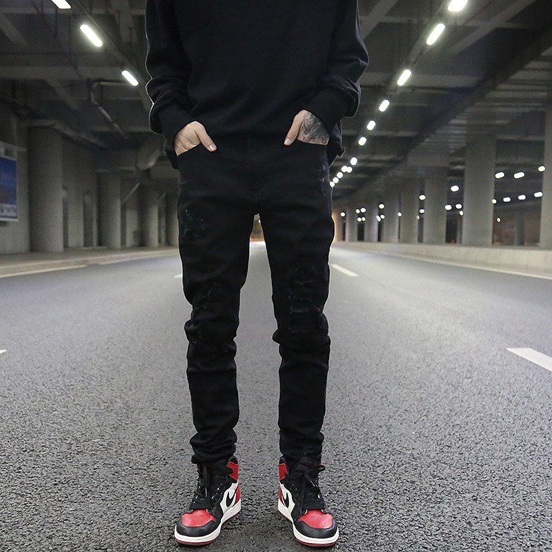 KANYE HIGH STREET wind hole patch BLACK WILD slim-fit small-legged jeans show leg LENGTH loss tie destruction trousers