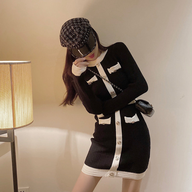 Autumn and winter 2020 new high-cold long-sleeved knitted dress slim slim hip base small short skirt