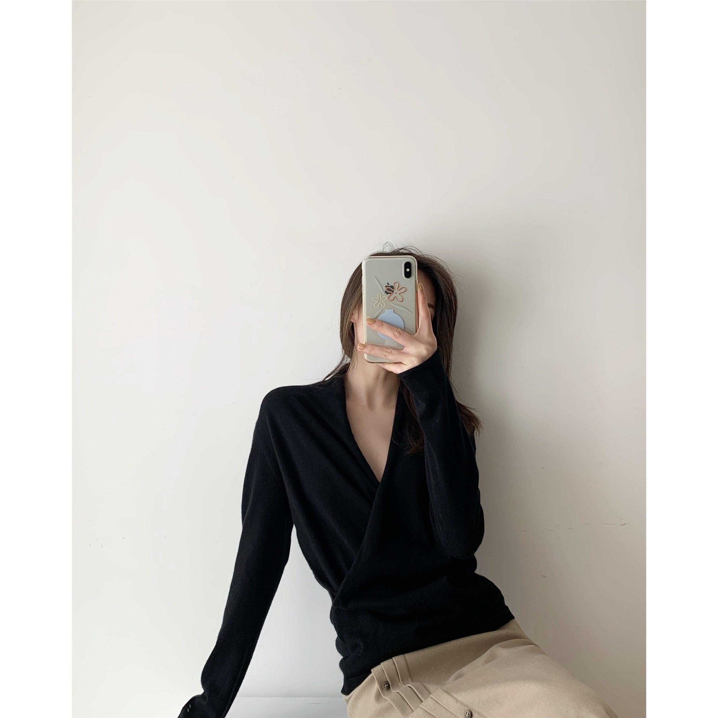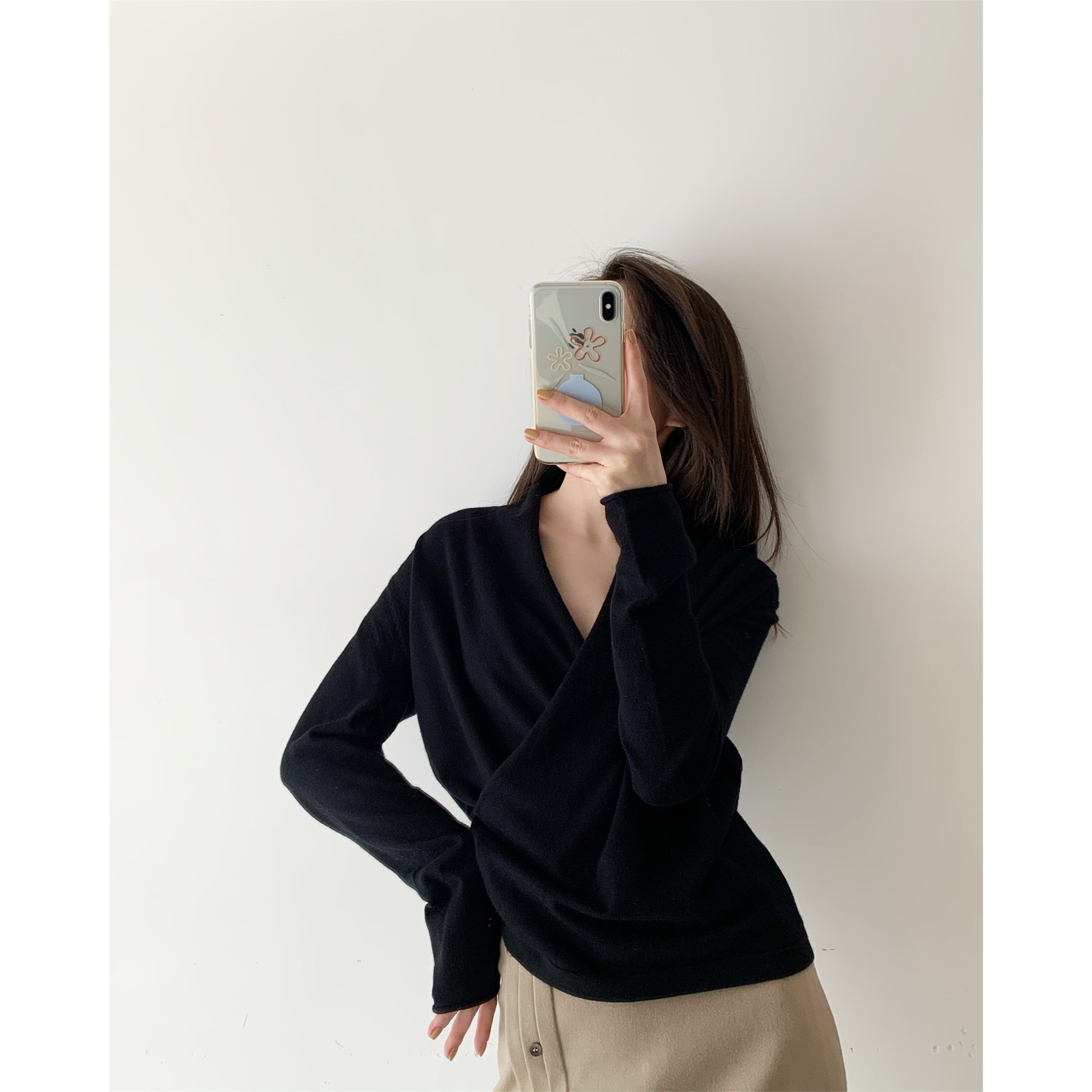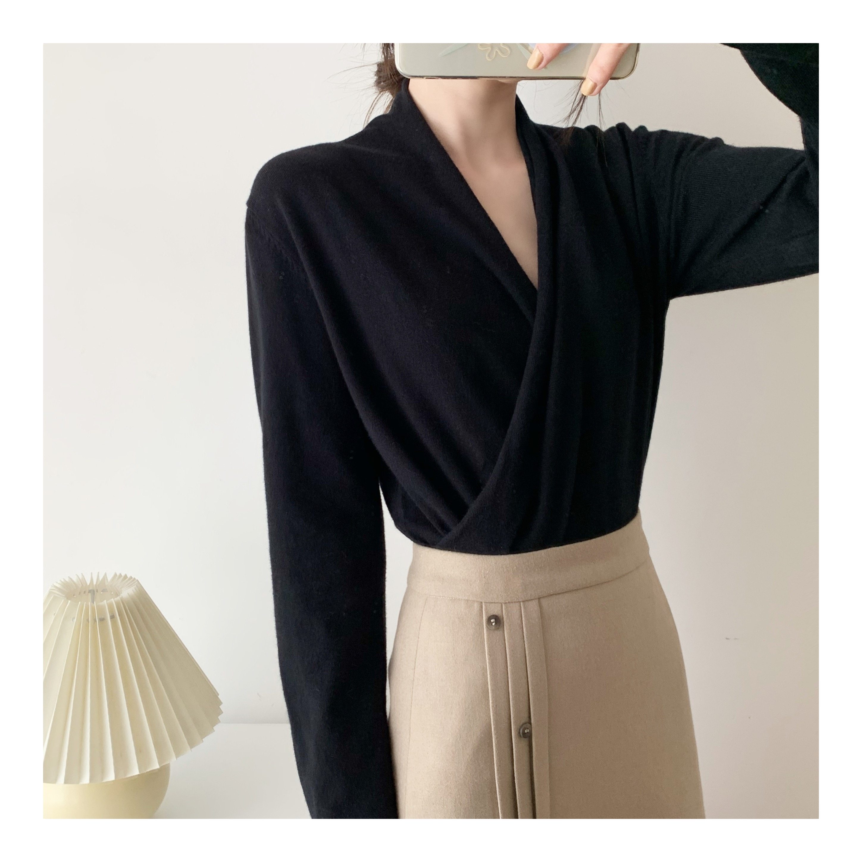 ICTS A Thousand Words Skip black base shirt Women's stacked sweater V-neck top Women's V-neck cross sweater