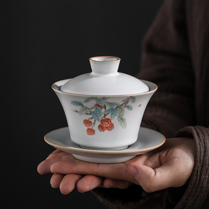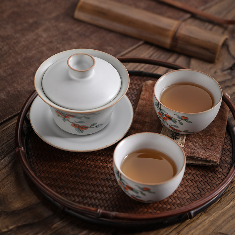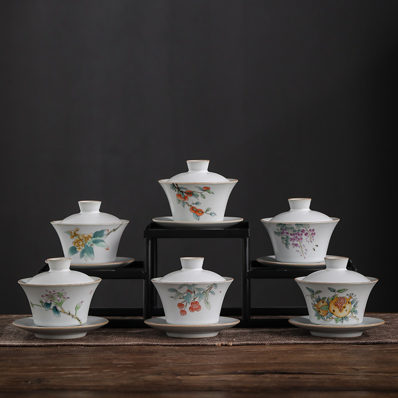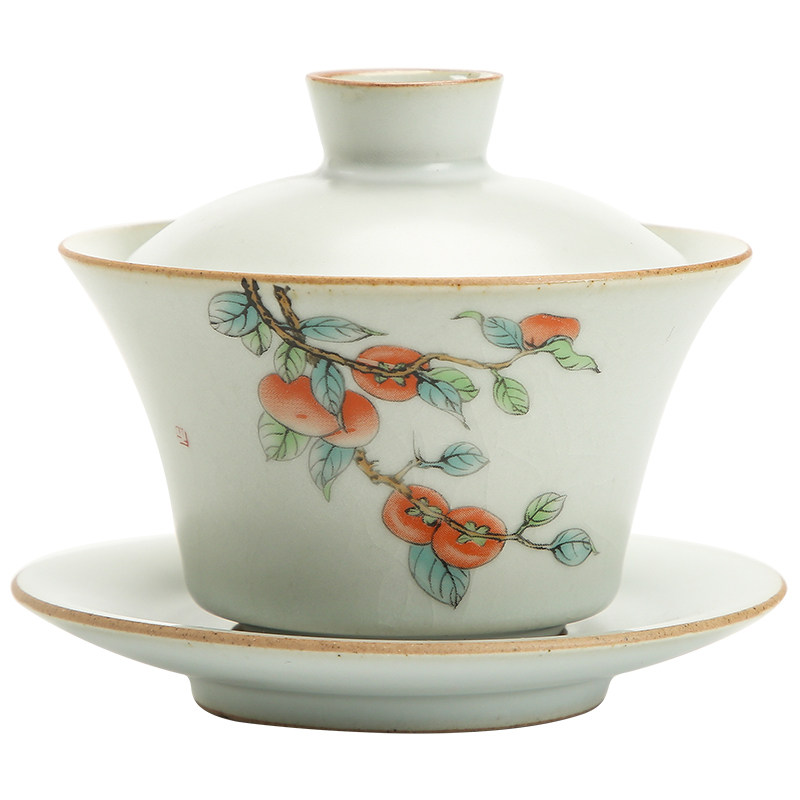 Ru Kiln Cover Bowl Purple Vine (send two cups) Thou kiln cover bowl Yulan (send two cups) Thou kiln cover bowl loquat (send two cups) Ru kiln cover bowl of persimmon (send two cups) Ru kiln cover bowl pomegranate (send two cups)