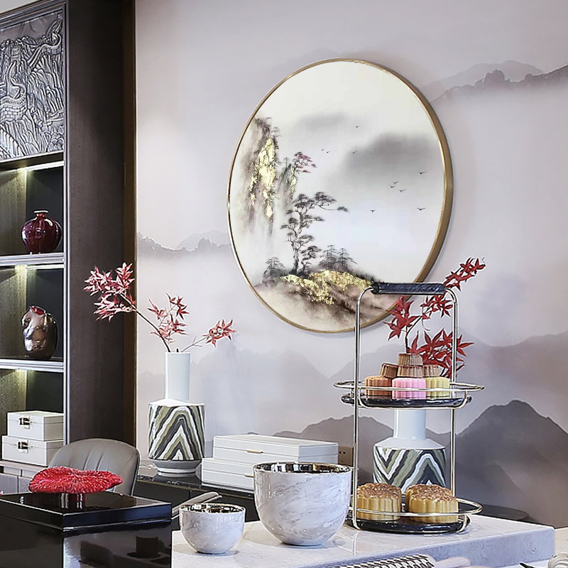 Hand-painted Oil Painting Round Decoration Painting New Chinese Genguan Gangway Corridor Back with mountain golden scenery Living room hanging painting