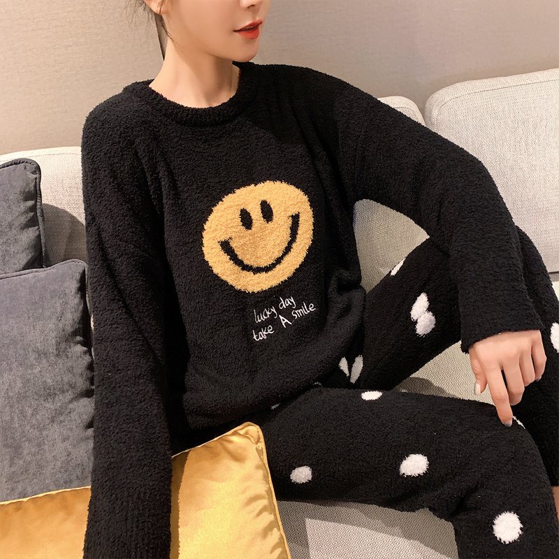 Black smiling face soft pajamas women's winter coral fleece net red cute thickened home service spring and autumn two-piece suit