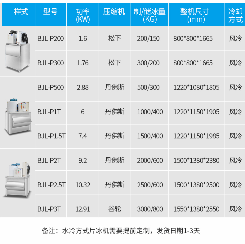 High-quality large-output 200 kg flake ice machine 200 kg flake ice machine (with cover) High with large output 300 kg flake ice machine 300 kg flake ice machine (with cover) 400 kg flake ice machine 500 kg flake ice machine (standard version) 500 kg flake ice machine (high-end version) High-end large output 1000 kg flake ice machine Large output high-end commercial flake ice machine