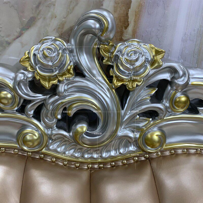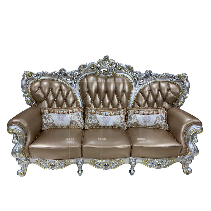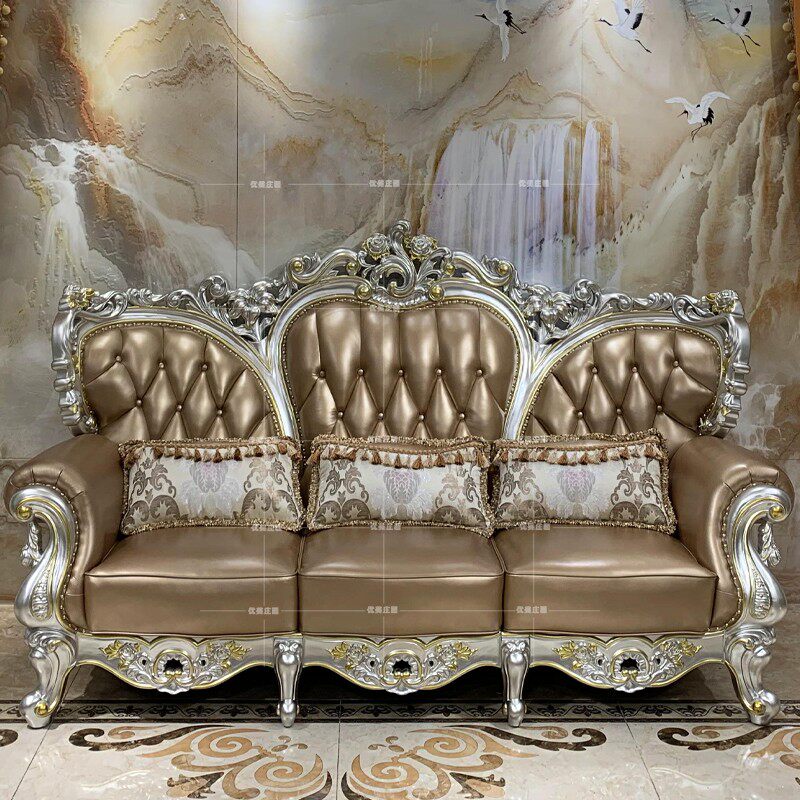 European leather sofa solid wood carving living room combination first layer cowhide Daping number champagne silver full set of French furniture