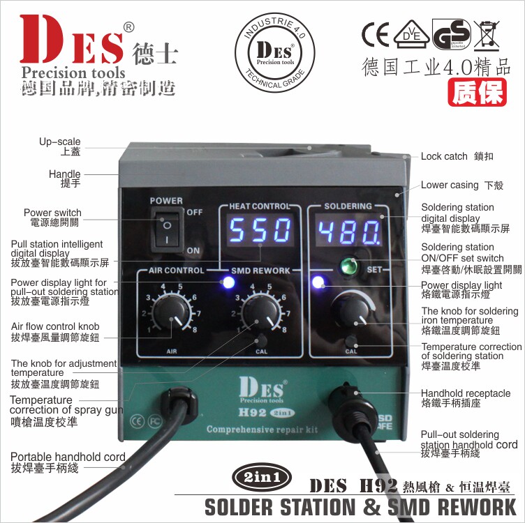 DES desserts German imports H92 Number of sensible wind guns Electric Iron Two-in-one Dismantling Welding Bench 1600W thermostatic 90w