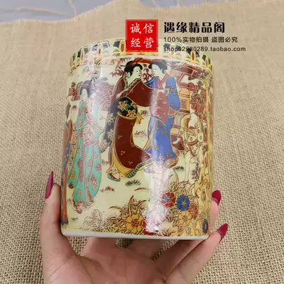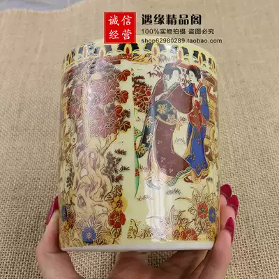Antique porcelain yellow glaze porcelain glaze color lady painting porcelain pen holder calligraphy and painting supplies height 12cm