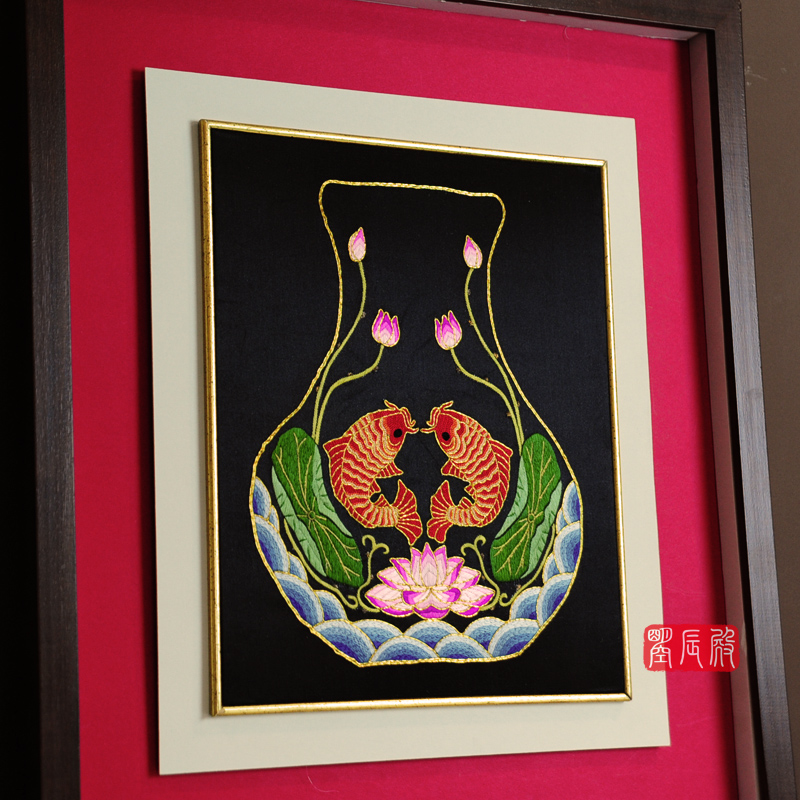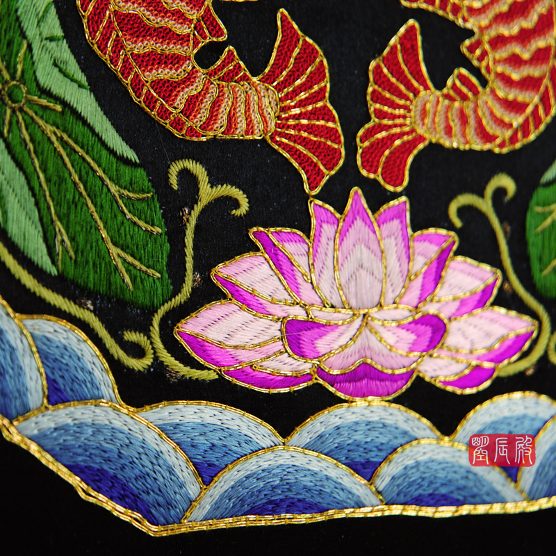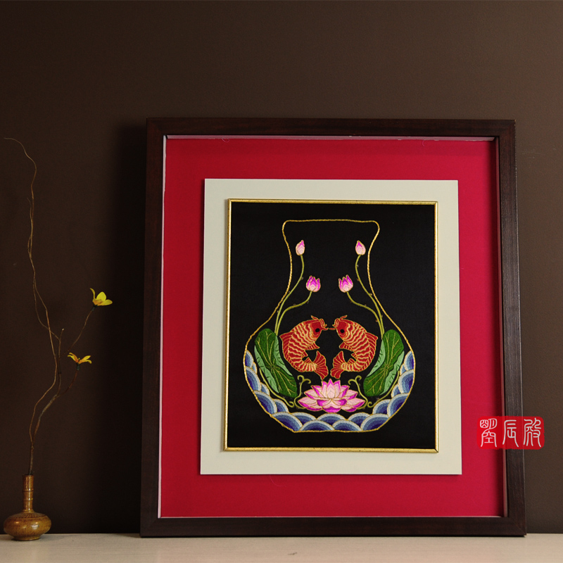 1980 Export Old Handmade Embroidery Craft Gift Pendulum Decoration Lotus Double Fish Chinese Style Chinese Wind Home Residence Decoration Painting Solid Wood Frames