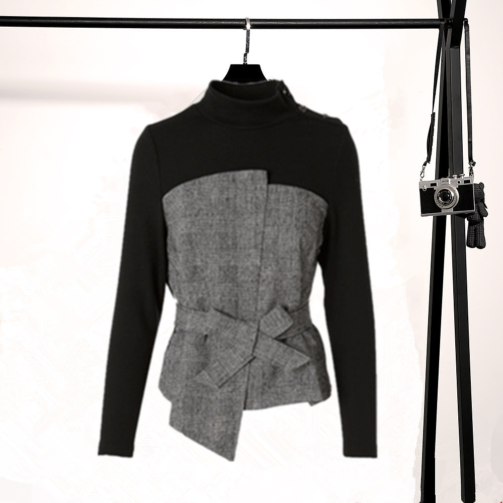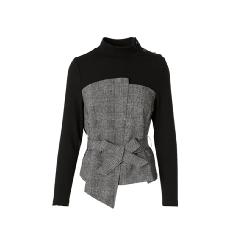 Yin'er 2019 winter new plaid lace-up knitted stand-up collar fake two-piece top female 8C59570150