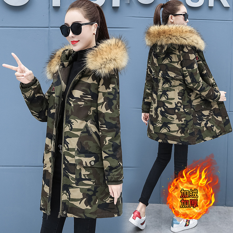 Winter camouflate cotton clothes woman thick Korean version loose with large fur collar tooling jacket gush water soldier dance warm military uniform cotton padded jacket