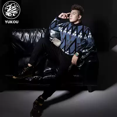 Yu Kou sweater men 2021 new winter plus velvet Korean trend slim color color jacquard card base sweater