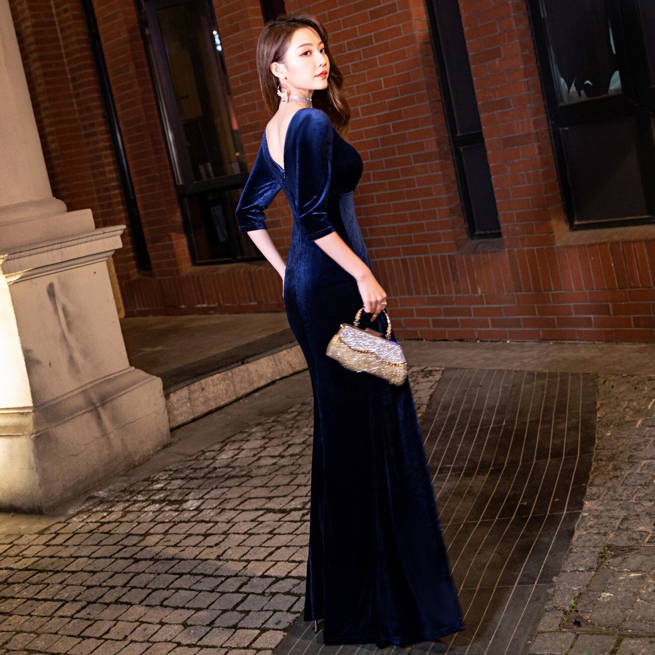 Evening dress female gas field queen navy blue velvet slim V-neck sexy fishtail dress banquet long version dress skirt women