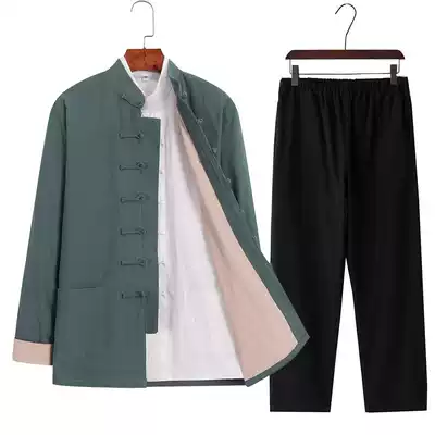 Cotton and hemp double-layer two-piece set Gray-green cotton and hemp double-layer two-piece set dark blue cotton and hemp double-layer two-piece set beige cotton and hemp double-layer two-piece set light gray cotton and hemp double-layer two-piece set maroon black red buckle Cotton and hemp double-layer two-piece set dark blue red buckle