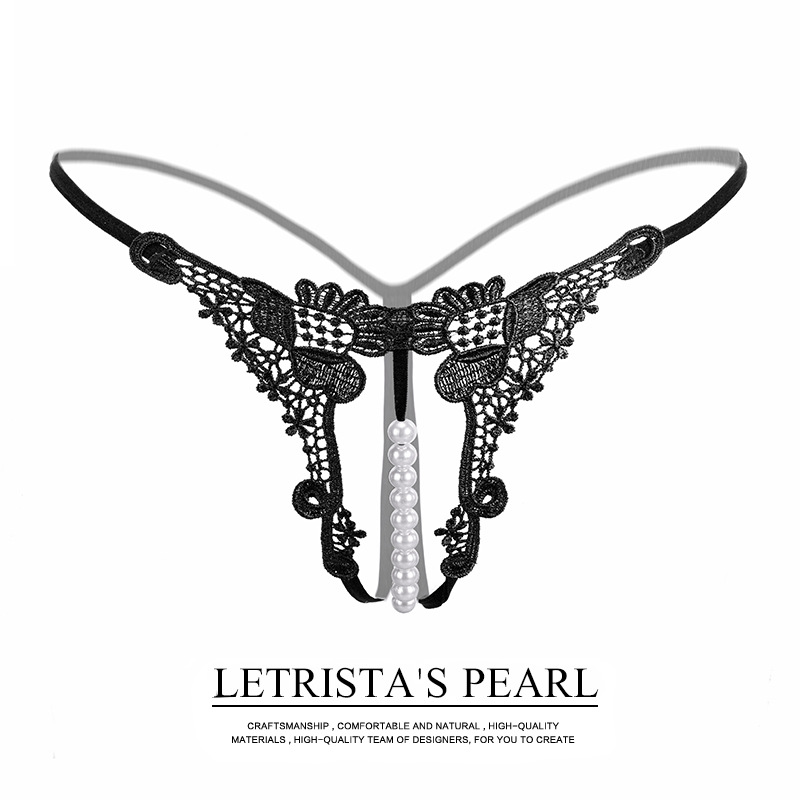 Transparent embroidered sexy panties ladies sexy open crotch pants hollow pearl massage show T pants low waist thong