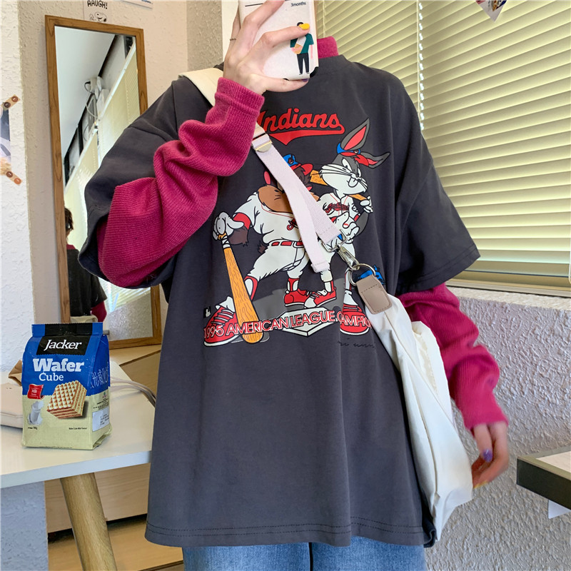 Fake two printed long sleeves T-shirt female hit undershirt Spring autumn 2021 New loose casual outwear with blouses