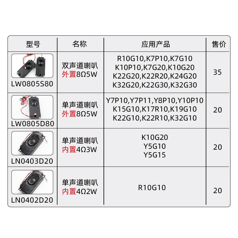 LW0805S80 (8Ω5W Mono)LW0805D80 (8Ω5W Mono)LN0403D20(4Ω3W Mono) LN0402