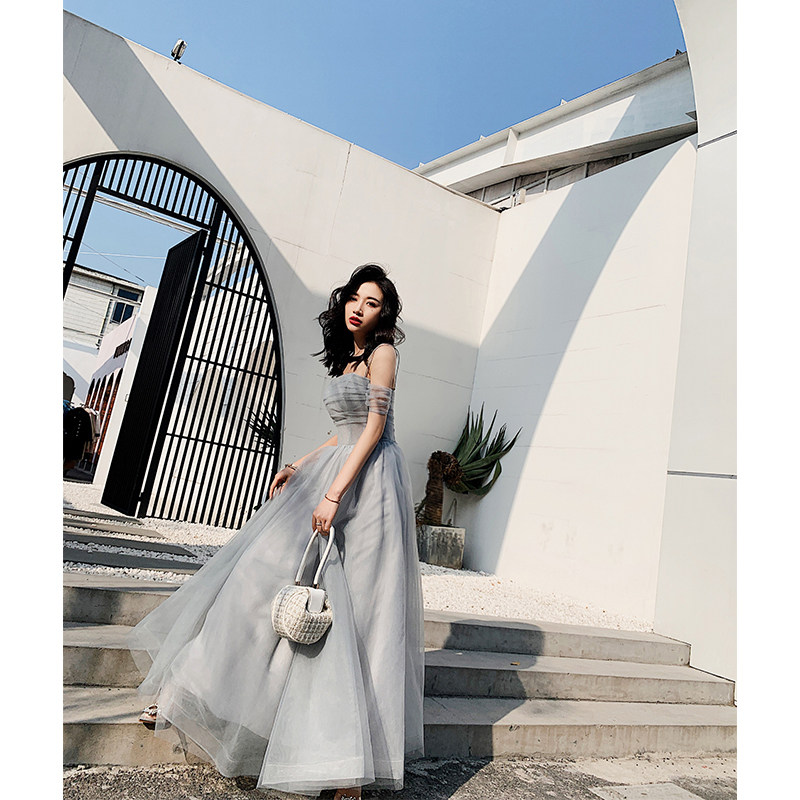 Ye Xiaoxian Blue gray word shoulder strap long bridesmaid dress sister group toast evening dress 2020 new model