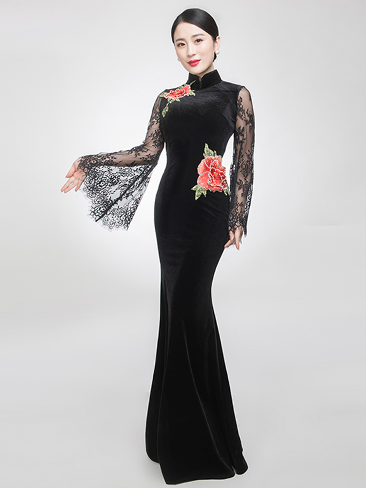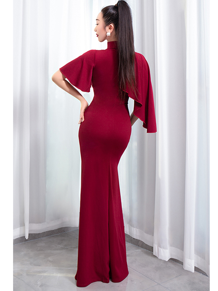 Wine Red Classical Qipao Chinese Wind Embroidered Irregular Floating Sleeve Model Walking Show Dance Performance Gift Instrument Single Side Open Fork
