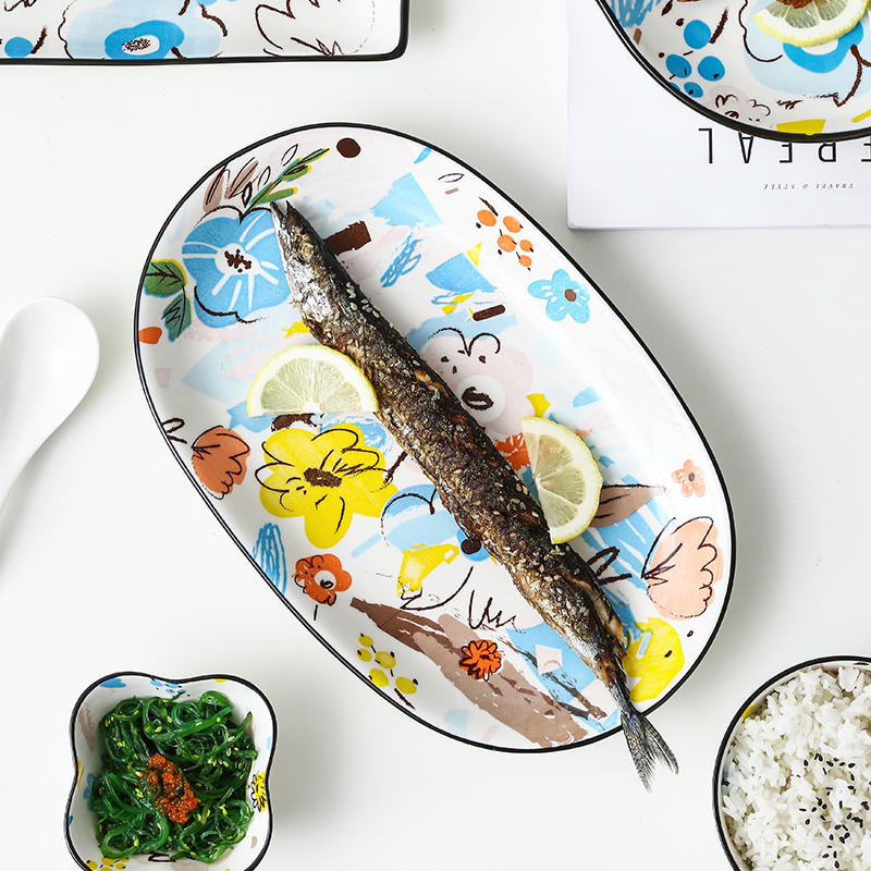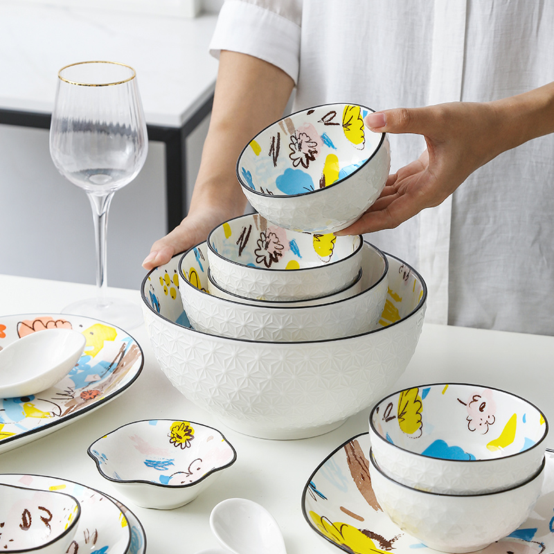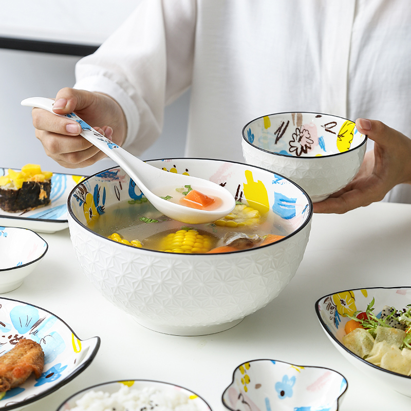 Japanese style illustration doodle bowl dish soup bowl spoon gift housewarming wedding Home ceramic tableware set combination