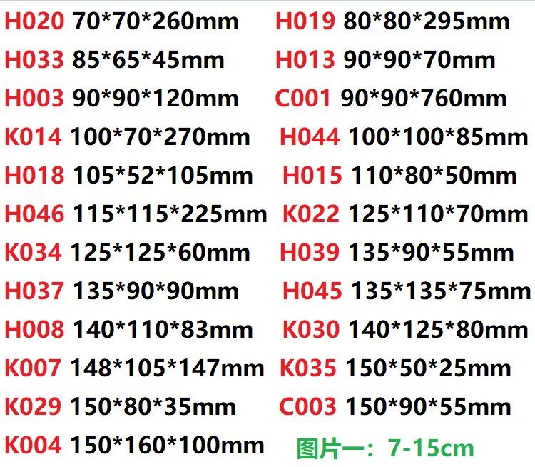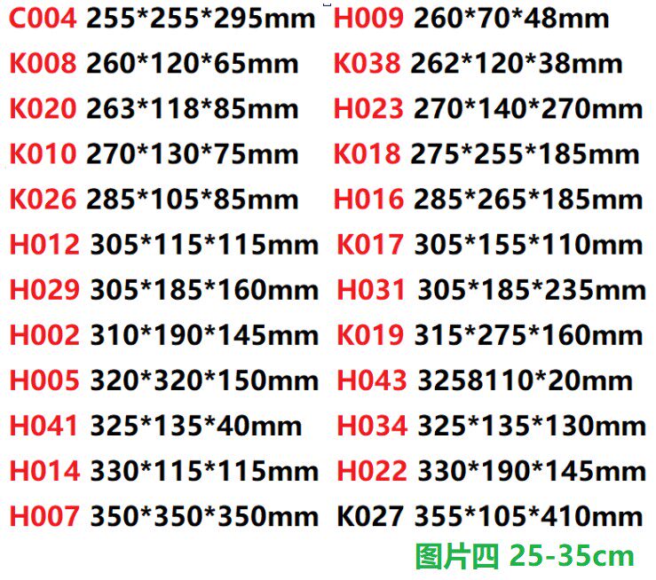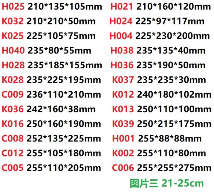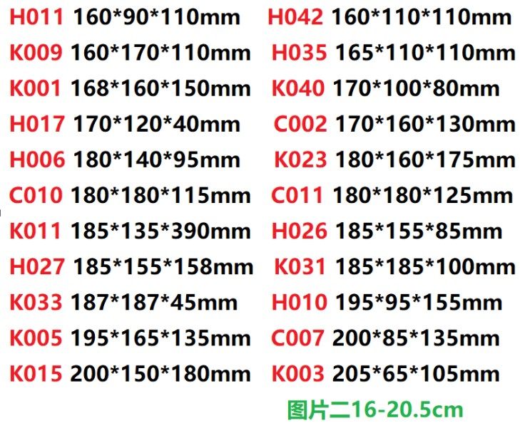 H031 305 * 185 * 235mmH012 305 * 115 * 115mmK017 305 * 155 * 110mmH029 3