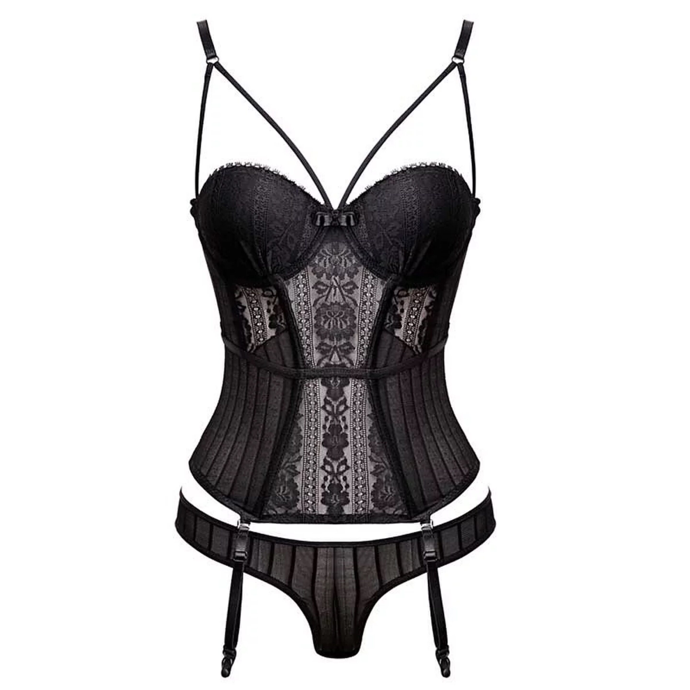 Small chest push sexy lace underwear slim pajamas female mesh sexy body sculpting vest black corset suit