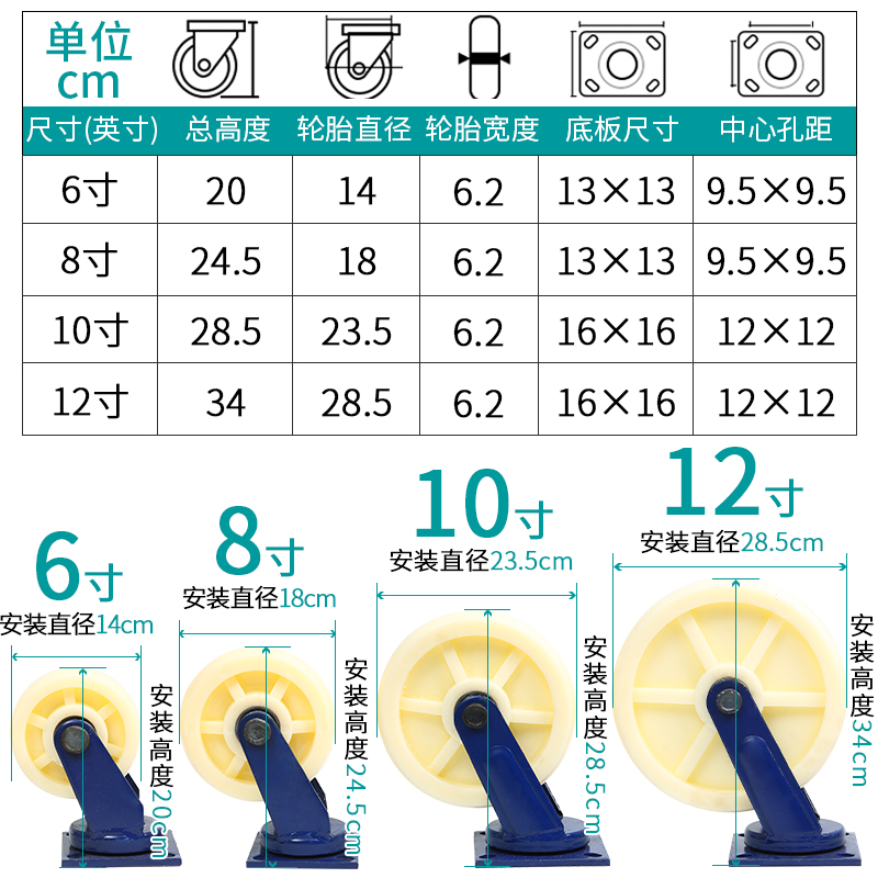 6-inch orientation wheel 6 inch universal wheel 6 inch brake wheel 8 inch orientation wheel 8 inch universal wheel 8 inch brake wheel 10 inch orientation wheel 10 inch universal wheel 10 inch universal wheel 10 inch brake wheel 12 inch