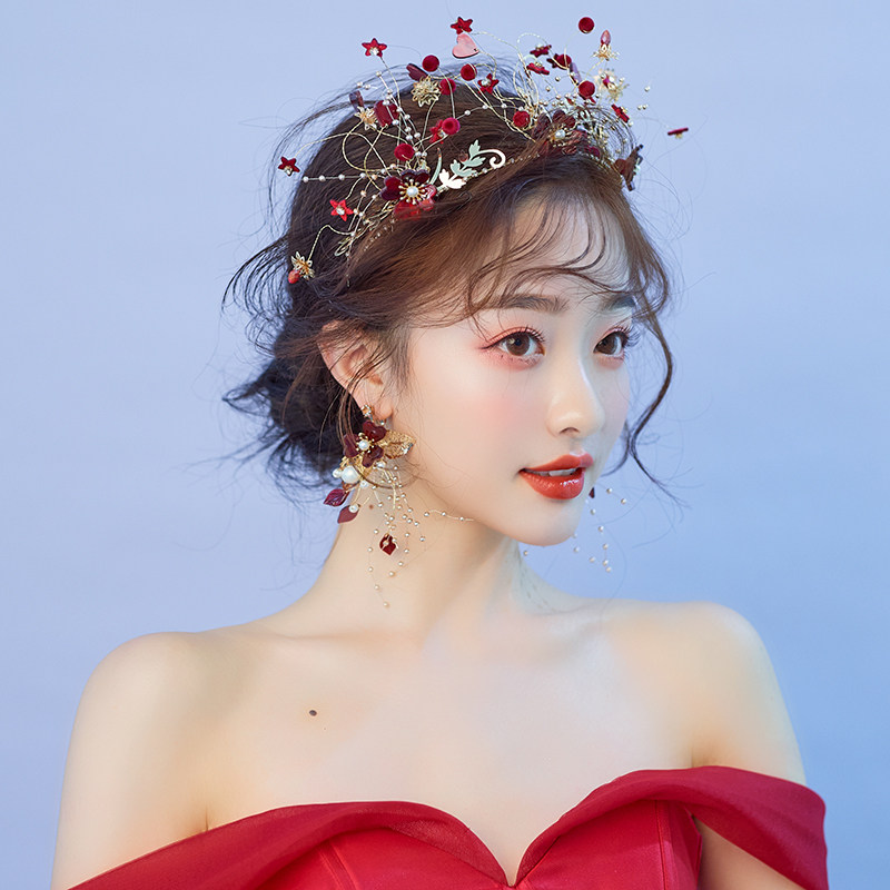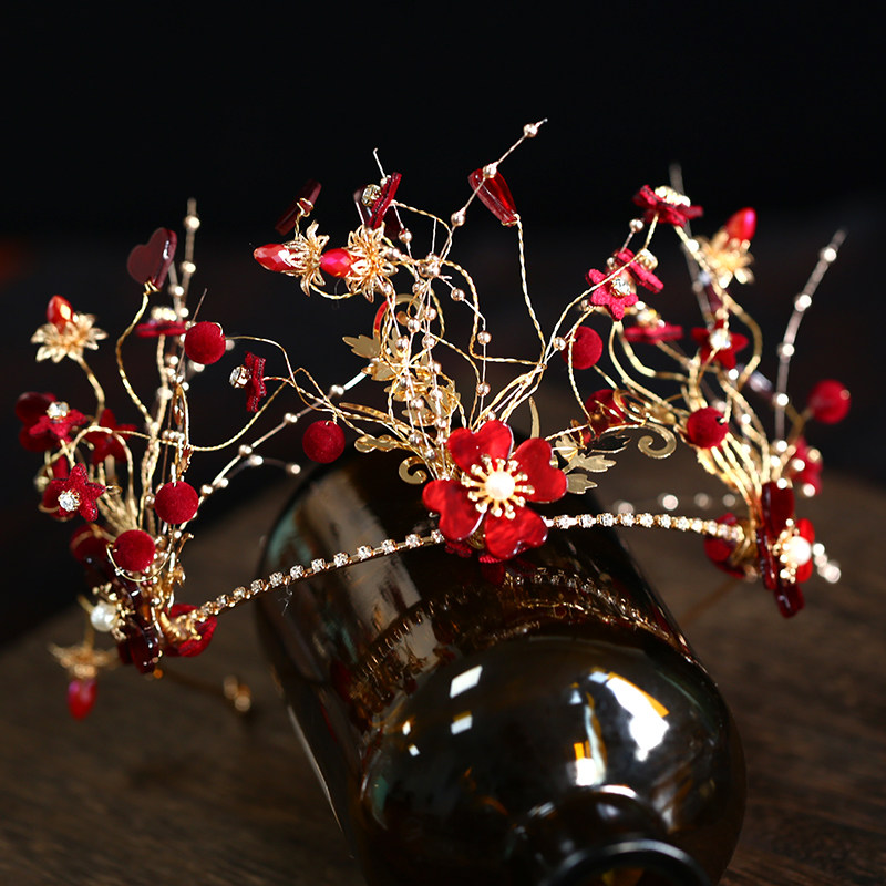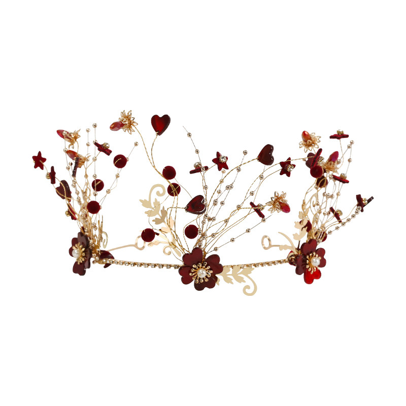 Cute Bridal Wine Red Color Retro Wedding Crown Handmade Flowers Golden Toast Hair Stirrup Styled Korean-style Styling Accessories