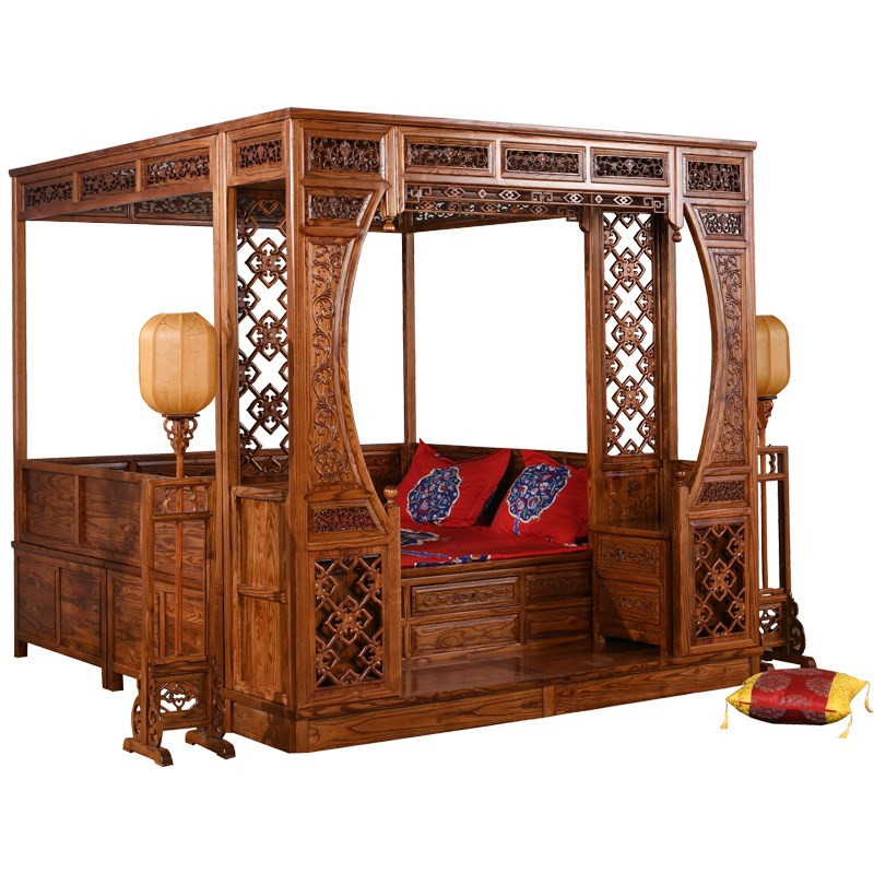 Solid wood Ming and Qing dynasty antique new Chinese mahogany elm wood carving thousands of workers step step step bed moon cave shelf bed double bed